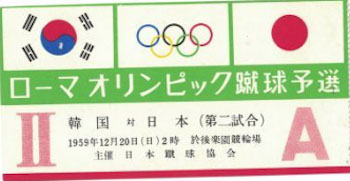 In December 1959 Japan played South Korea in a men's Asian Qualifier for the 1960 Summer Olympics. The Qualifier consisted of two games, both played in the Korakuen Velodrome in Tokyo. South Korea won the first game 2-0 on 13 December in front of 20,000 supporters with second half goals from Choi and Moon. Although Japan managed to win the second game 1-0 on 20 December with a goal from Ninomiya, it was South Korea which advanced on a 2-1 aggregate to play China in the final qualifying round.