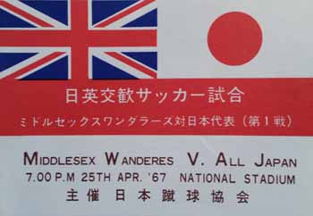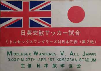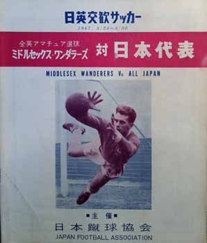 Middlesex Wanderers FC was founded in 1905 as a touring team, with the objective of promoting 'good fellowship among the football and other sporting organisations throughout the world'. The team is selected from semi-professional footballers around the UK by a committee and acts as an ambassador for the UK. In 1967 the Wanderers embarked on a tour of the Far East, beginning in Japan with three games. In the first game in the Tokyo National Stadium on 25 May Middlesex Wanderers defeated the Japanese National Team 3-1 in front of 46,000 supporters. In the second game on 27 May in the Komazawa stadium Japan gained revenge with a 2-1 victory. In the final game on 30 May, Middlesex Wanderers defeated Japan 2-1 with all the goals coming in the second half.