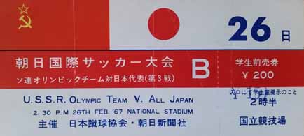 The Russia Olympic Football Team travelled to Japan in February 1967 to play four games in total including three games against the Japan National Team. Russia won the first two games 2-0 and 3-1 on 19 February and 22 February respectively. A 0-0 draw on 26 February meant honours were shared in the final game.