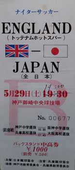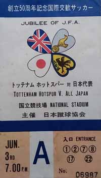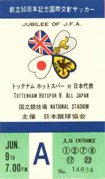 The first programme was only sold at the first game in Kobe and is particularly rare, as is the ticket for the game shown below. The programme has 14 x B5 pages in landscape format (with only two pages of adverts) and is all in Japanese. The programme has two pages of introductions from the Japan FA etc. and then lists details of the three games to be played on the tour. There is an article on Spurs and on the centre pages there is a Spurs team photo and the squad list. Details are given of the Japan squad together with small photos of the players and finally there is a blank memo page.