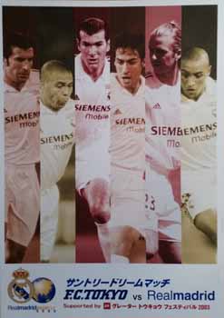The official 76 page programme is shown below. Apart from one introduction in Spanish, the programme is all in Japanese. The programme begins with three pages of introductions from the dignatories. Following is four pages with details of the Real Madrid and FC Tokyo players with small photos of the players. The next 3 pages contain an article on Real Madrid and its history followed by 19 pages with extensive articles on David Beckham, Ronaldo, Raul, Roberto Carlos, Zidane, Figo, Casillas, Makelele and Helguera. The next two pages are an article on Real Madrid manager Carlos Queiroz. The next 3 pages contain an article on FC Tokyo and its history followed by 12 pages with extensive articles on their players including Amaral, Ishikawa and Jean. The next two pages are an article on FC Tokyo manager Hiromi Hara. There is an article on possible formations both teams could use followed by a final page with space to enter team line-ups, scores and scorers etc.